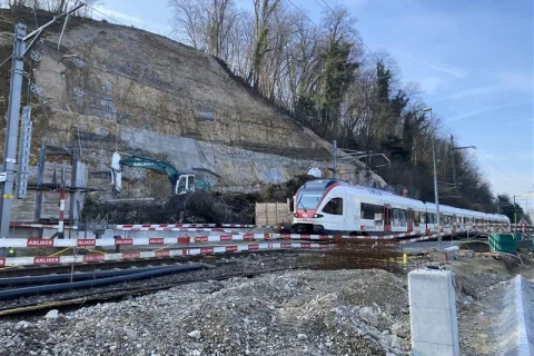 Cette offre nécessite une extension de l’infrastructure ferroviaire. Aussi les CFF, sur mandat de la Confédération, construisent-ils depuis le printemps 2023 une double voie sur la ligne entre Grellingen et Duggingen dans le Laufonnais. Pour le démantèlement de l’infrastructure ferroviaire à simple voie et la construction de la double voie, le tronçon Grellingen–Duggingen doit être complètement interdit à la circulation ferroviaire du 26 avril au 28 septembre 2025.